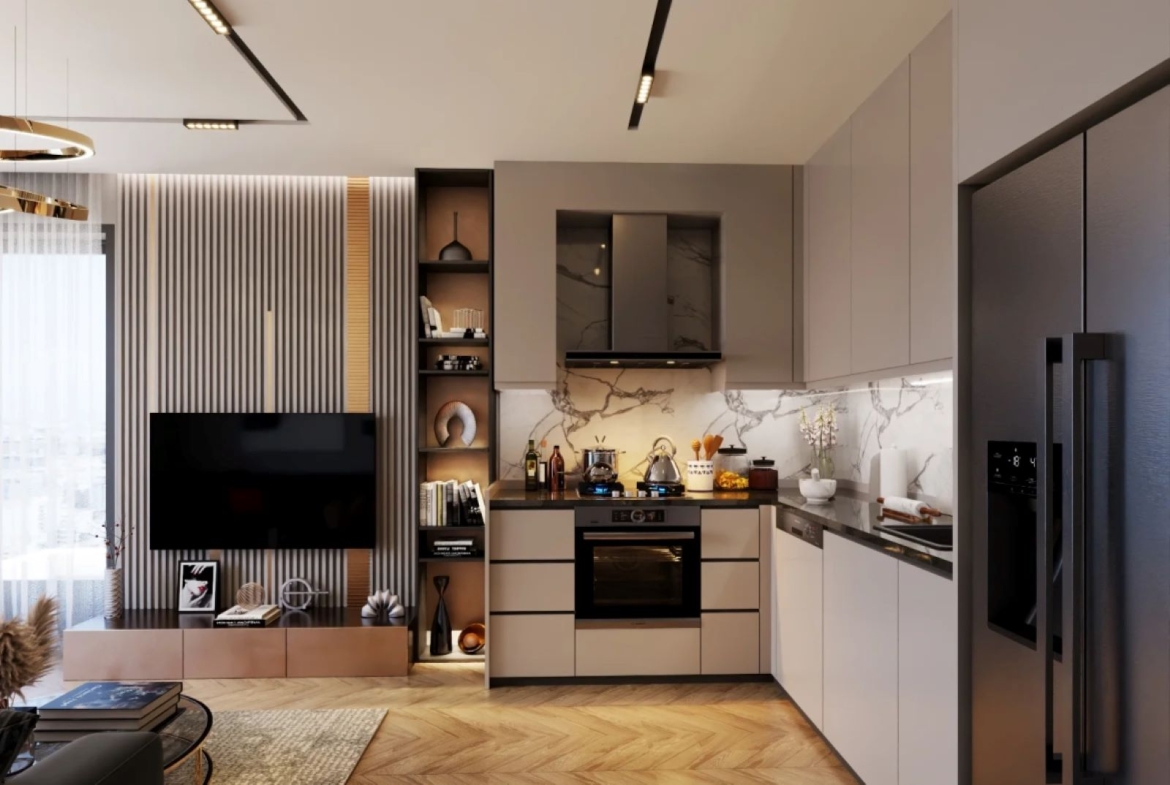 Зайдите внутрь, и вас встретит стильный и продуманный интерьер. Просторная гостиная легко переходит в элегантную кухню открытой планировки, что делает ее идеальным местом для повседневной жизни и общения. Отделанная в соответствии с концепцией роскоши, квартира включает в себя кондиционер, полы с подогревом и интегрированную систему «умный дом«, которая обеспечивает комфорт и удобство под рукой.