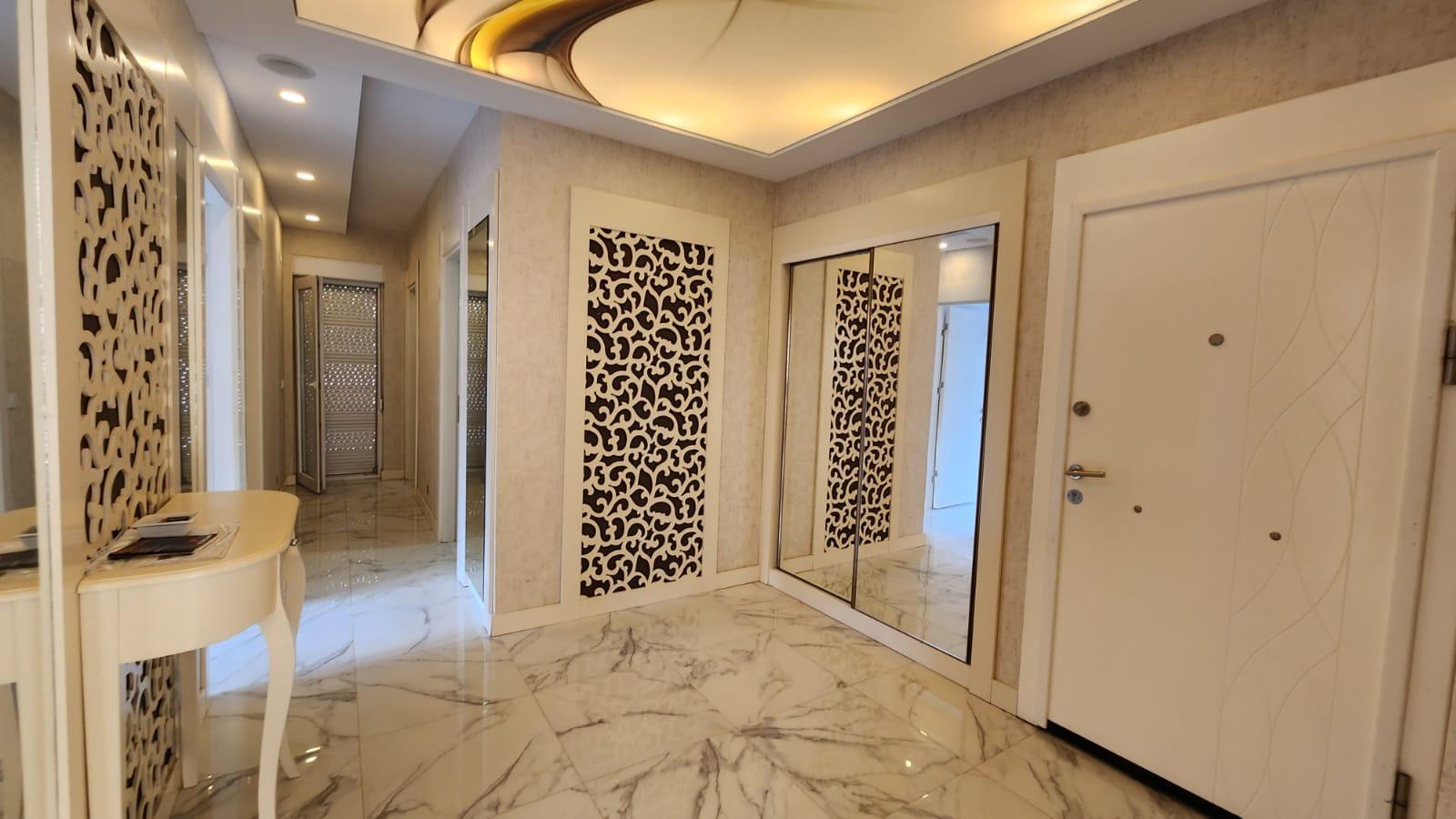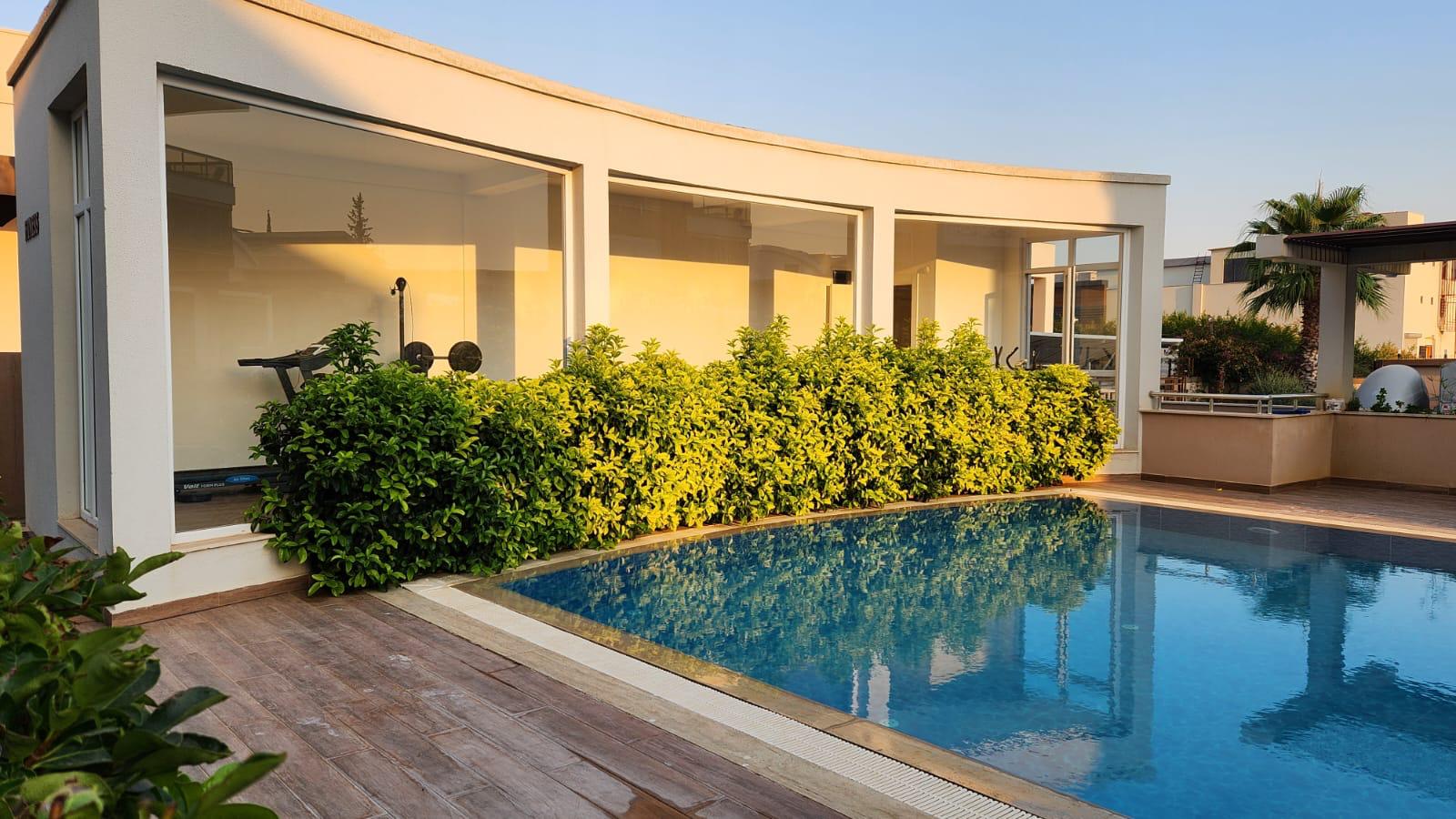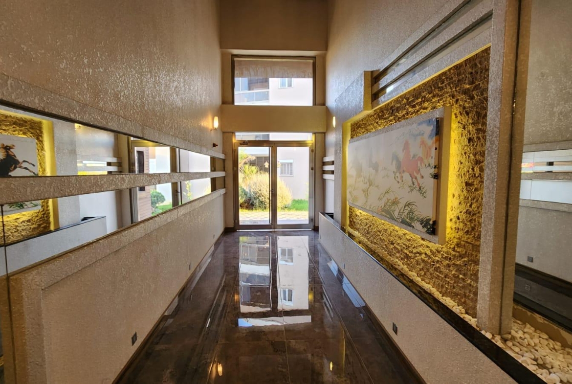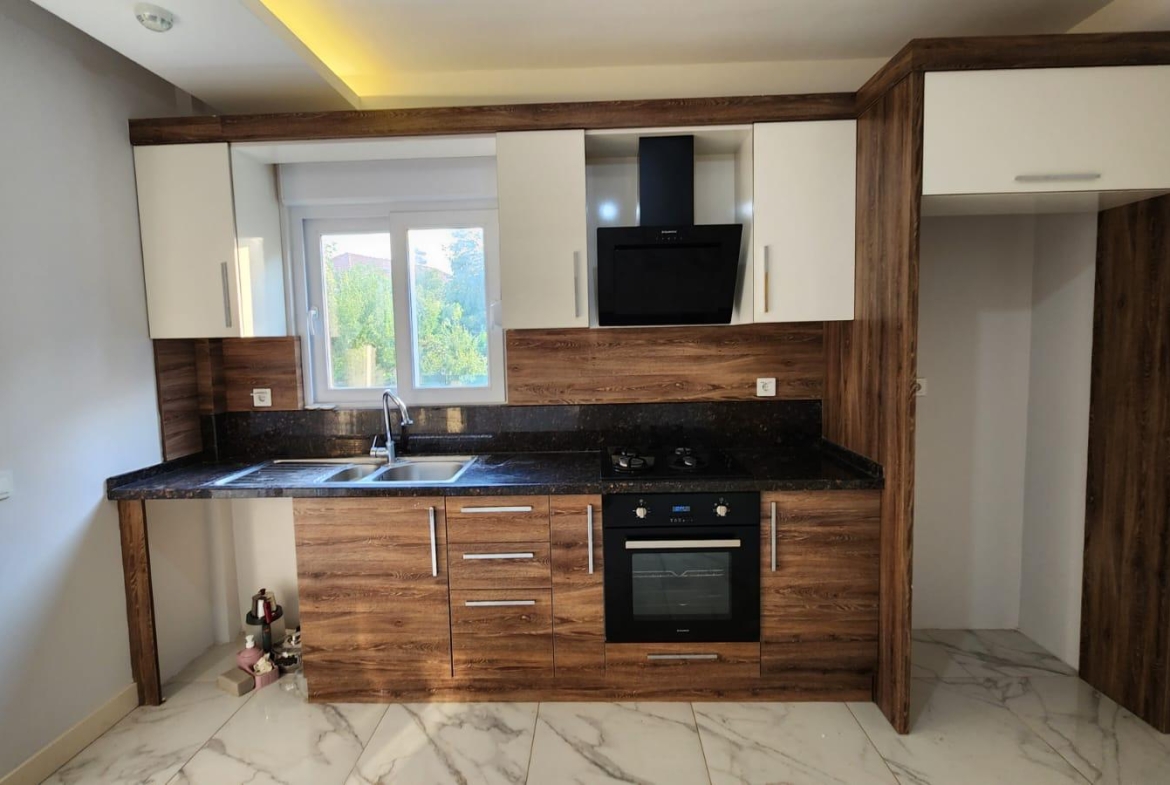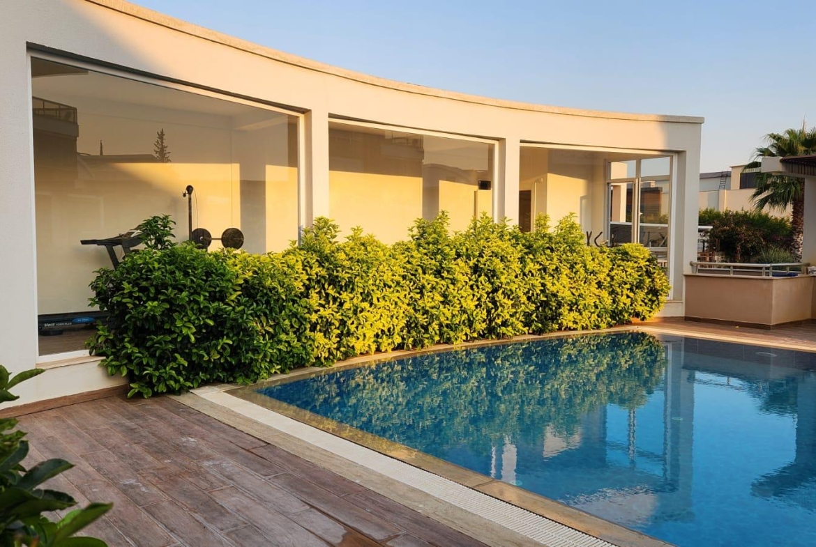 На продажу выставлена квартра на нижнем этаже в стиле « модерн». Квартира воплощает в себе совершенство современной архитектуры, инженерной мысли и великолепной работы дизайнеров. Она расположена в районе Дёшемеалты в комфортабельном жилом комплексе. В услуги которого входят: большой бассейн, детская площадка, фитнес зал, охраняемый въезд, парковка, круглосуточная охрана и многое другое. На приусадебном участке разбит ландшафтный сад. . Жилая площадь здания 170 кв.м., в нее входят большая гостиная, отдельная комфортабельная кухня, три спальни и две ванные комнаты. Вилла в три этажа. На первом этаже расположены гостиная , отдельные кухня и гостевой санузел. Из холла широкий коридор ведет в просторную гостиную с большими окнами и стеклянными дверьми, ведущими в сад и к бассейну. Одна из стен оборудована под тв сет.